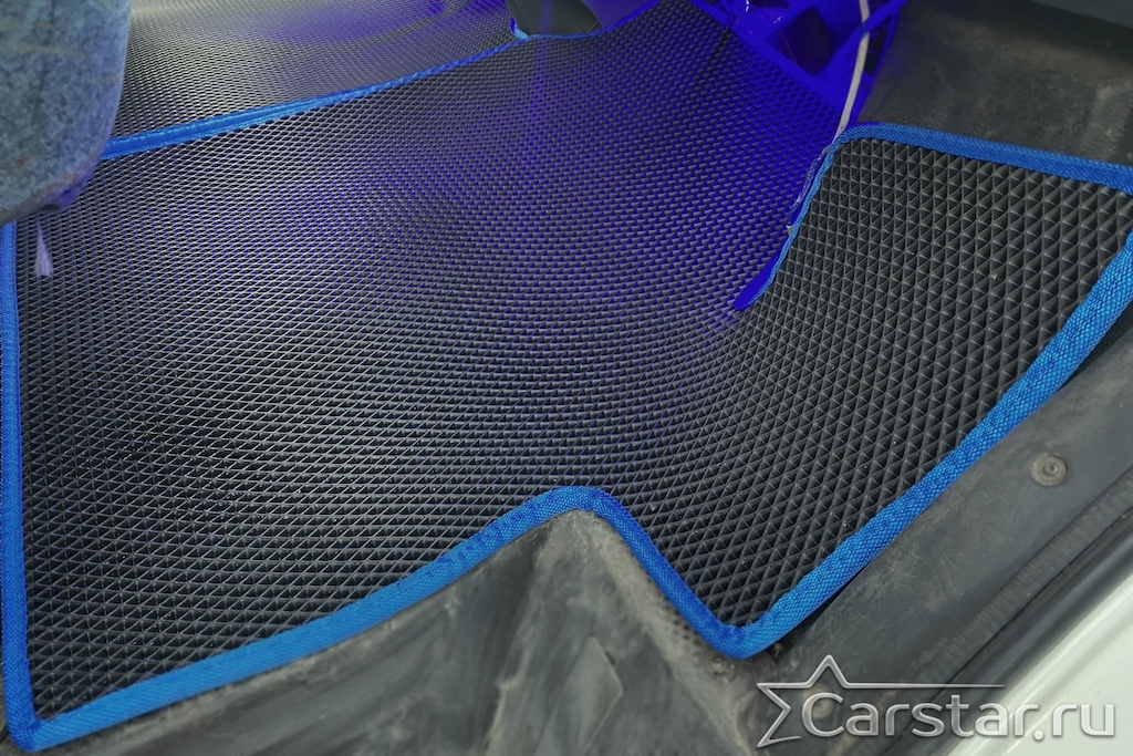 Толщина ковриков EVA составляет 10-12 мм. Глубина ячеек 7-8 мм. Такая толщина ковриков позволяет им служить довольно долго, не протираясь до 3 лет. А благодаря такой глубине ячеек коврик EVA площадью 1 кв.м. способен захватить около 3,5 л жидкости, сохраняя в чистоте вашу обувь и обивку салона.