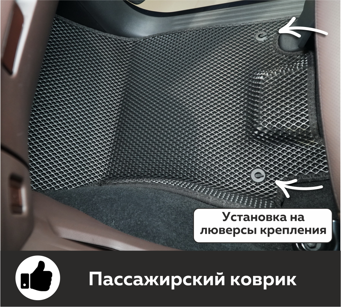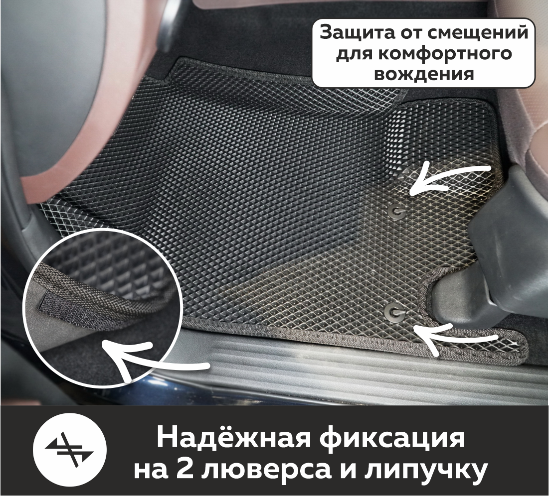Коврики EVA надёжно крепятся с помощью оригинальных систем фиксации. Благодаря клипсам и липучке коврики защищены от смещений, что обеспечивает комфорт и безопасность вождения. Максимальное удобство также достигается точными, улучшенными лекалами для каждого автомобиля.
