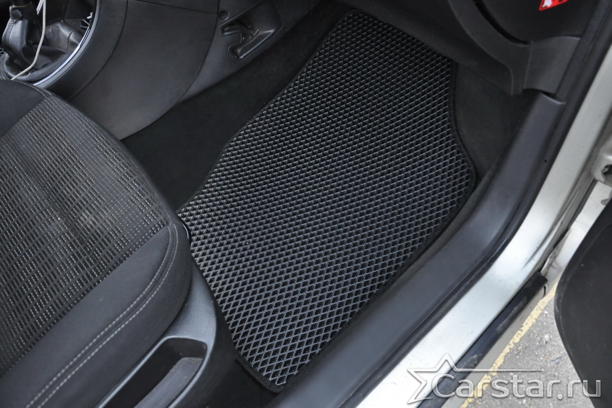Толщина ковриков EVA составляет 10-12 мм. Глубина ячеек 7-8 мм. Такая толщина ковриков позволяет им служить довольно долго, не протираясь до 3 лет. А благодаря такой глубине ячеек коврик EVA площадью 1 кв.м. способен захватить около 3,5 л жидкости, сохраняя в чистоте вашу обувь и обивку салона.