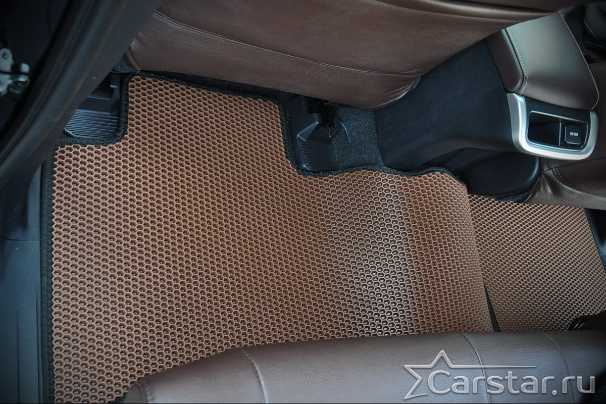Толщина ковриков EVA составляет 10-12 мм. Глубина ячеек 7-8 мм. Такая толщина ковриков позволяет им служить довольно долго, не протираясь до 3 лет. А благодаря такой глубине ячеек коврик EVA площадью 1 кв.м. способен захватить около 3,5 л жидкости, сохраняя в чистоте вашу обувь и обивку салона.