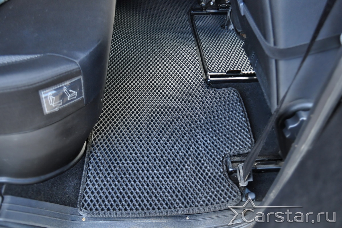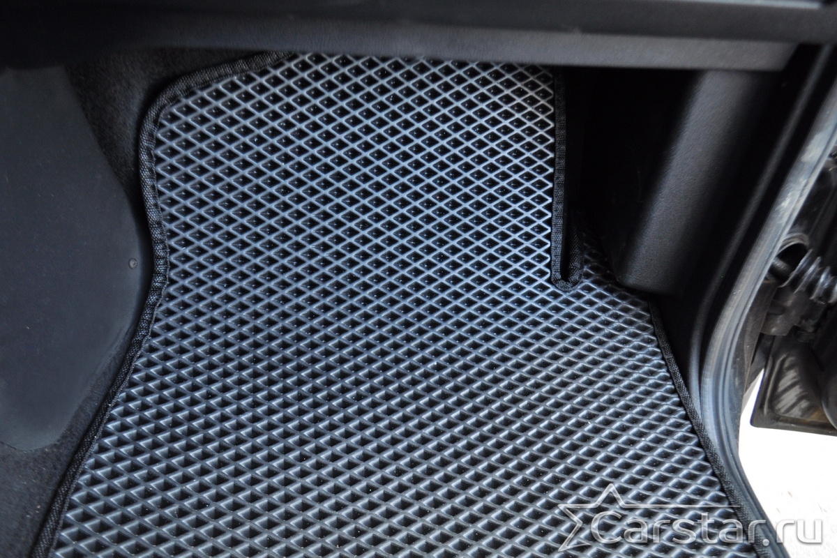 Толщина ковриков EVA составляет 10-12 мм. Глубина ячеек 7-8 мм. Такая толщина ковриков позволяет им служить довольно долго, не протираясь до 3 лет. А благодаря такой глубине ячеек коврик EVA площадью 1 кв.м. способен захватить около 3,5 л жидкости, сохраняя в чистоте вашу обувь и обивку салона.